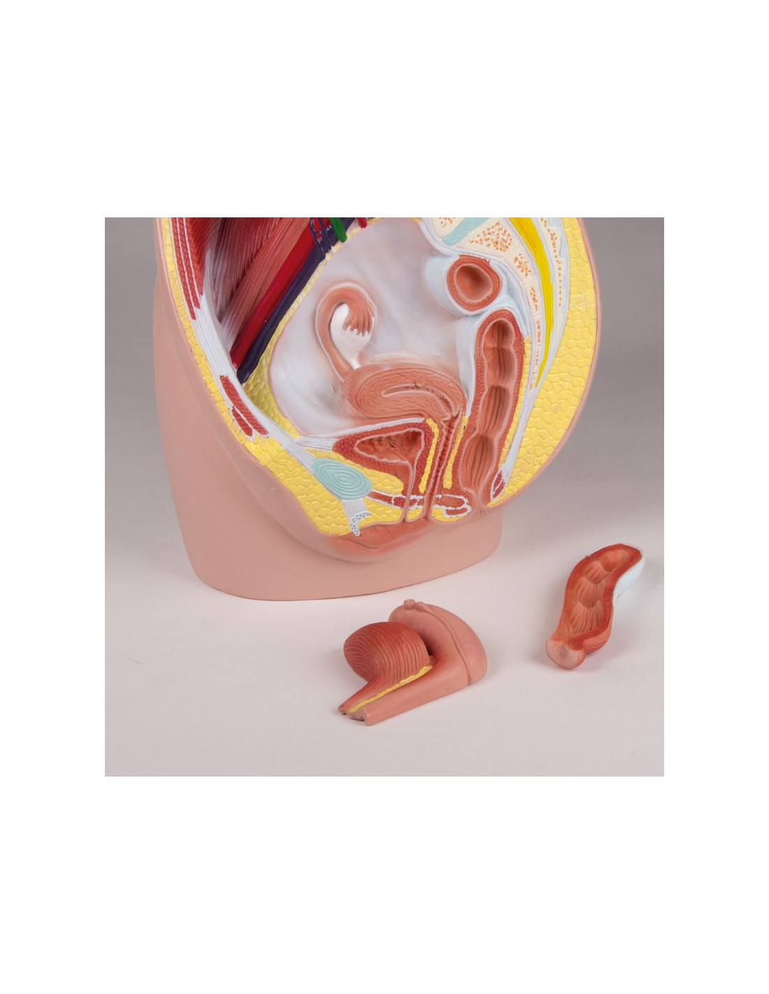 Ce nouveau modèle de bassin féminin est la reproduction d’un pelvis féminin à taille réelle, représenté en section médiosagittale et présente le bassin féminin en 3 parties.