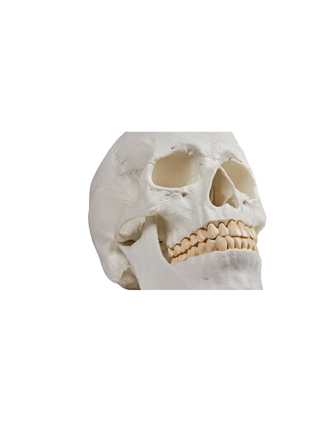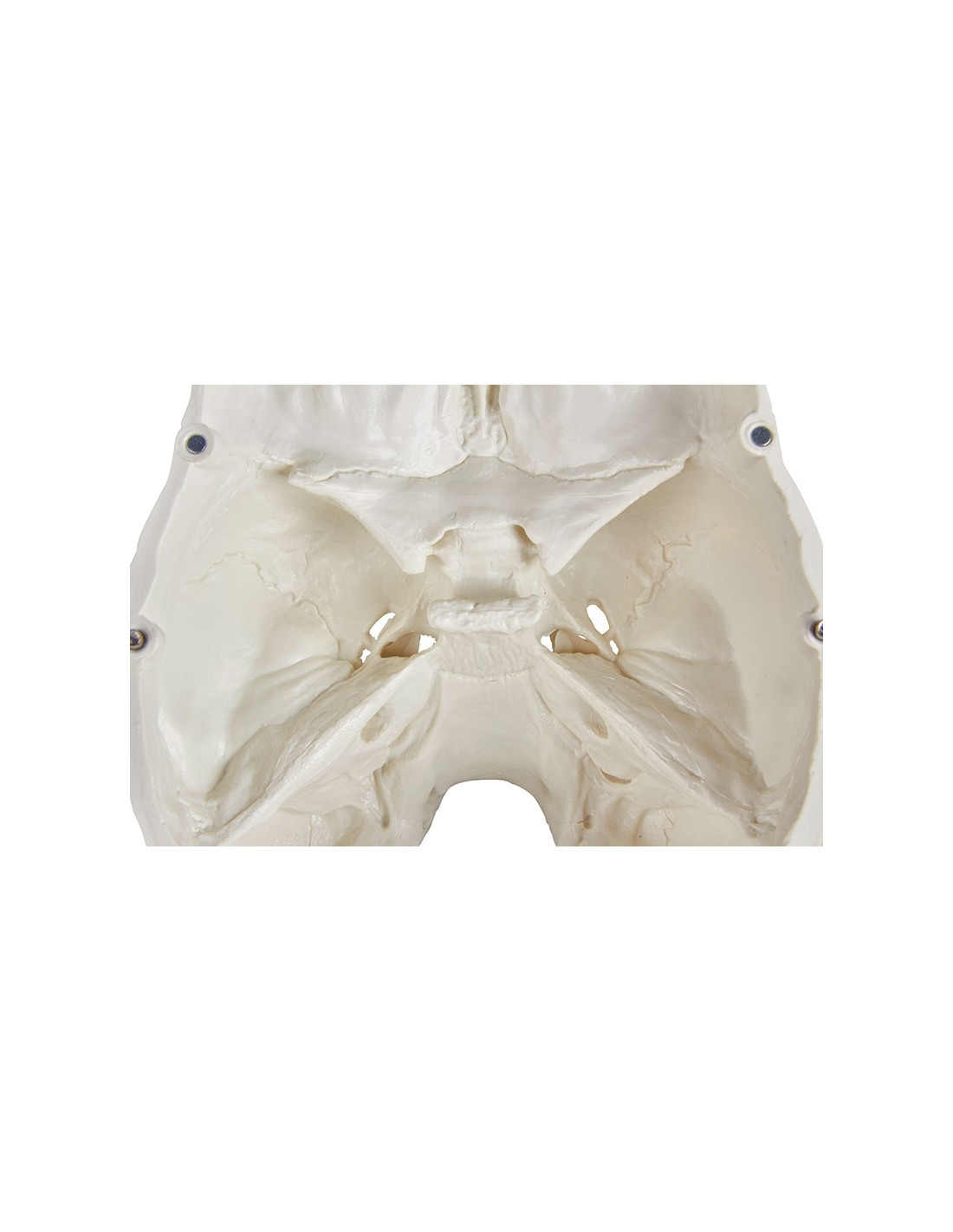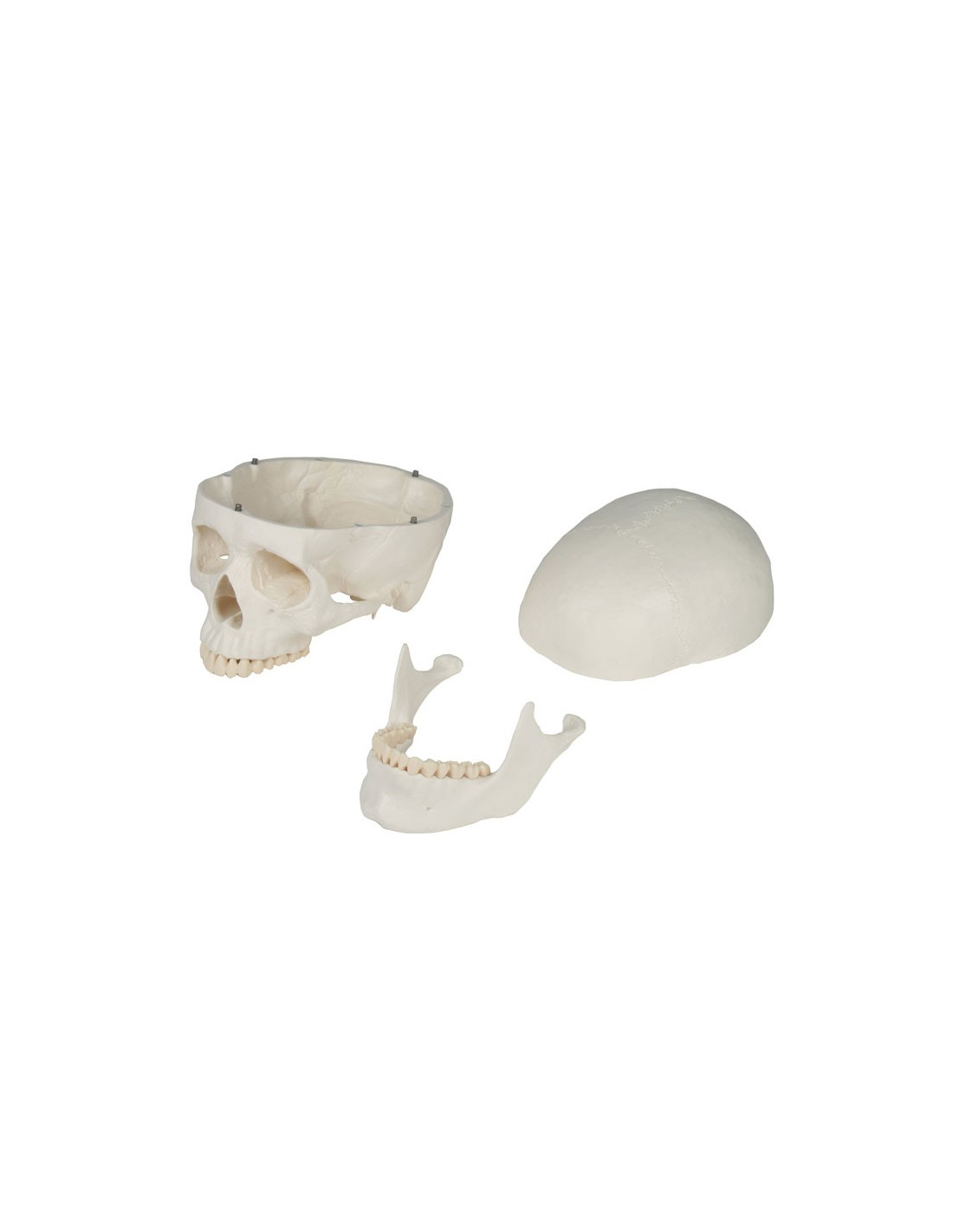 Le modèle didactique de crâne est décomposable en trois parties, et est composé d'une base crânienne, calotte et mandibule. Les dents correspondent aux vraies. La mandibule eest mobile et peut être retirée.