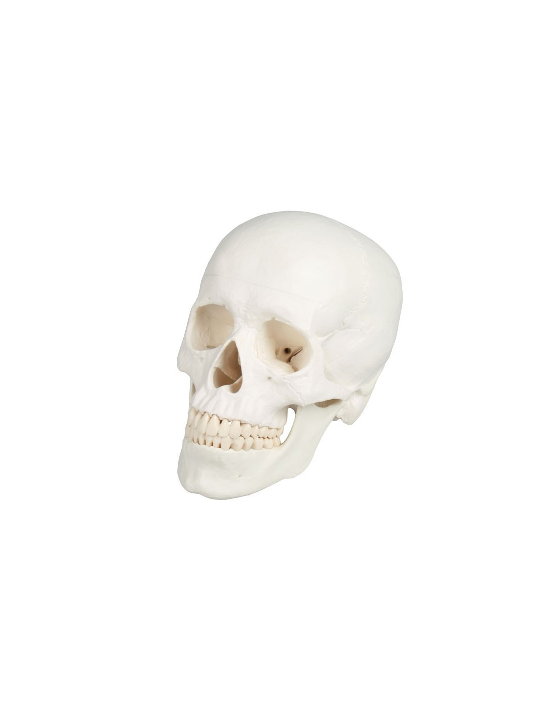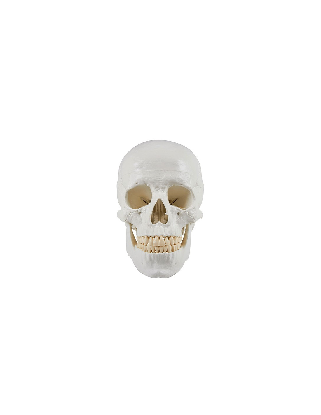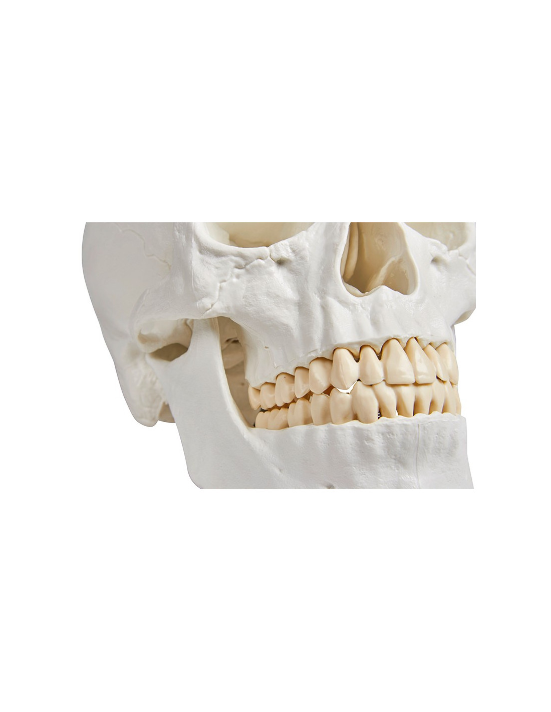 Le modèle didactique de crâne est décomposable en trois parties, et est composé d'une base crânienne, calotte et mandibule. Les dents correspondent aux vraies. La mandibule eest mobile et peut être retirée.