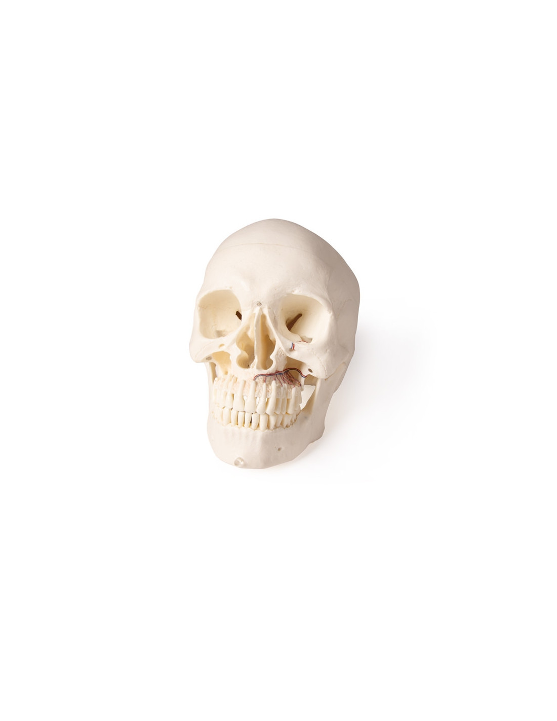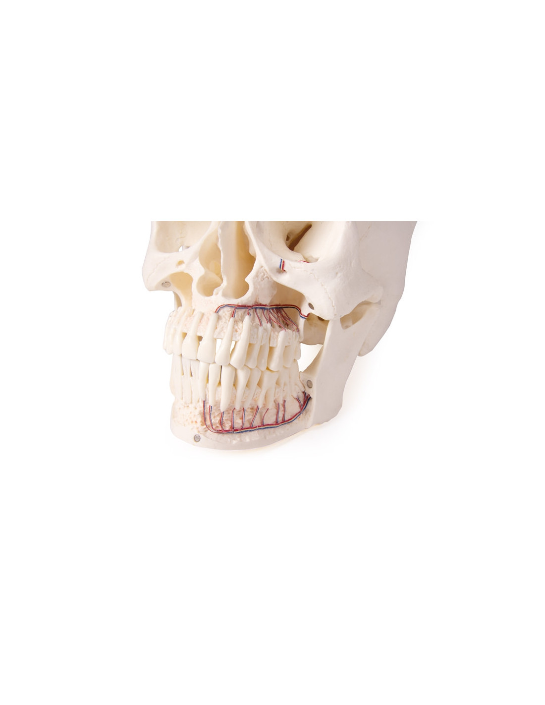 La moitié antérieure de la mâchoire supérieure et inférieure peut être retirée afin de révéler les dents avec racines, nerfs unilatéraux et vaisseaux sanguins, sans oublier les sinus maxillaires.
