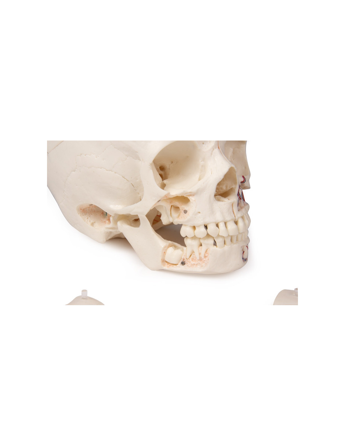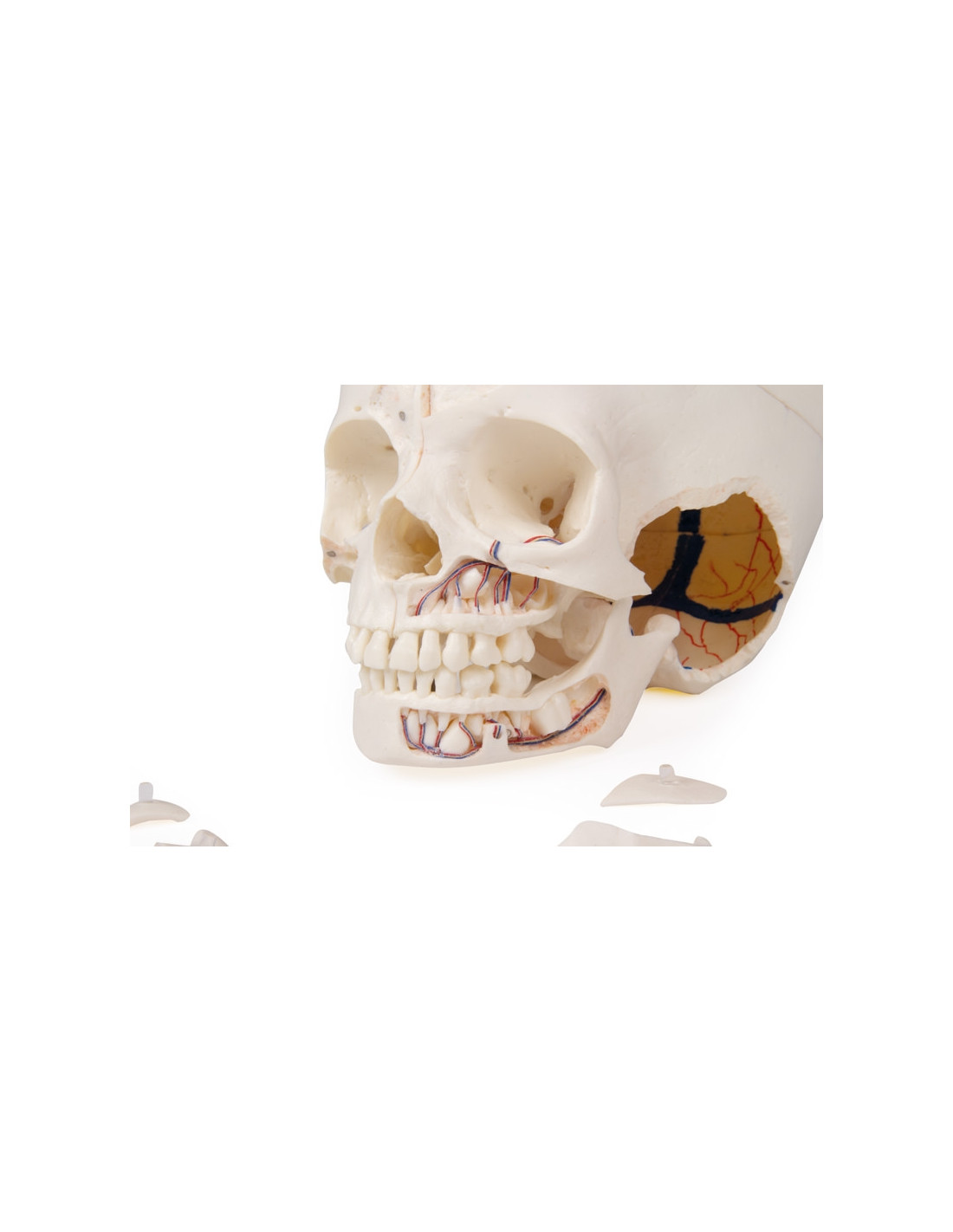 La mâchoire supérieure et celle inférieure démontrent les structures des dents, les racines, le bord osseux du processus alvéolaire, sans compter les nerfs et vaisseaux dentaires. Le sinus maxillaire peut être ouvert en retirant un morceau.