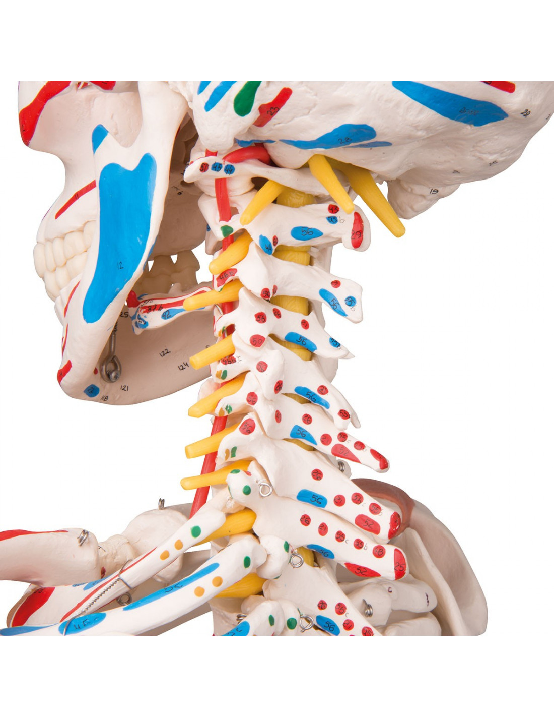 Ce squelette humain reporte les origines et insertions musculaires, toutes peinte manuellement. Il est ainsi possible d'étudier l'interaction entre système musculaire et chaque os du squelette.